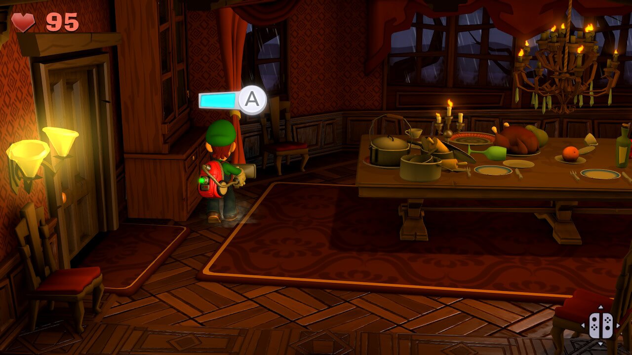 Lorsque vous parcourez le manoir, ne vous attendez pas à une promenade de santé. Les lieux sont serrés, sombres, et très chargés en petits éléments avec lesquels vous pouvez interagir. Luigi’s Mansion 2 HD est le contre exemple parfait à celles et ceux qui ne jurent que par le modèle des jeux en monde ouvert : si la surface est très petite, il y a énormément de densité et beaucoup de choses à faire. Chaque nappe de table, objet traînant par terre, ou petit animal peut être aspiré par votre Ectoblast. Ici, rien ne sert d’aller vite : ça n’est même pas réellement une option pour compléter plus rapidement le jeu. Il faudra prendre le temps de fouiller les pièces de fond en comble, et c’est de cette façon que vous rentrerez aussi dans l’ambiance si particulière de Luigi’s Mansion 2 HD.