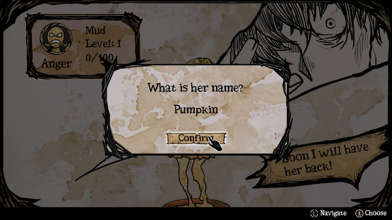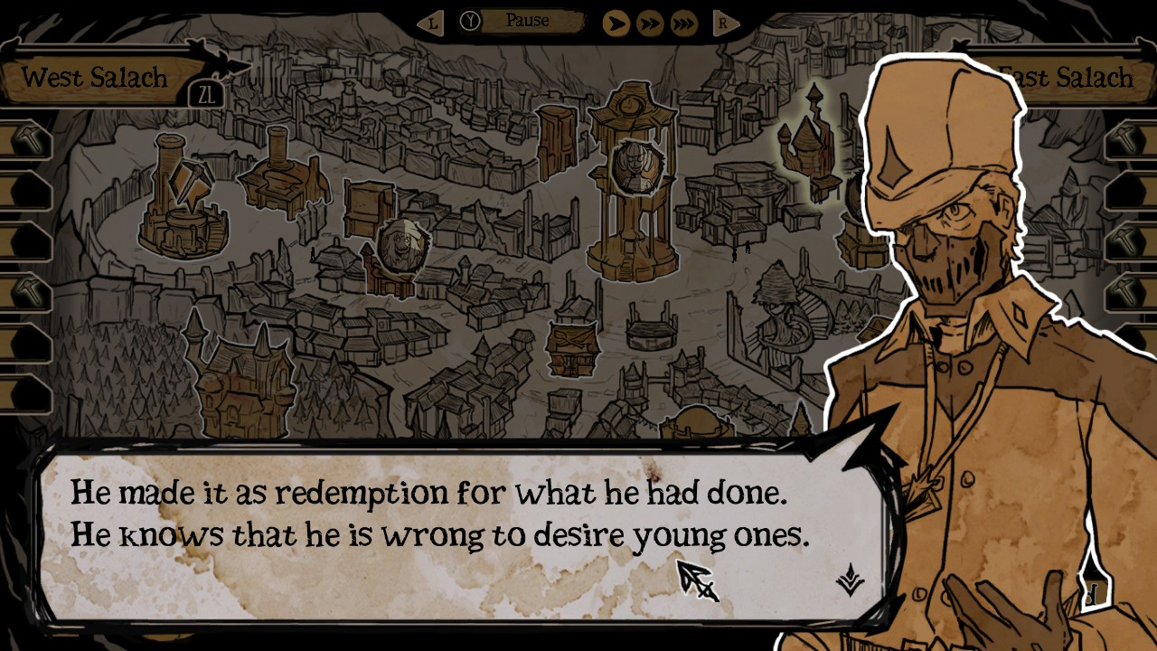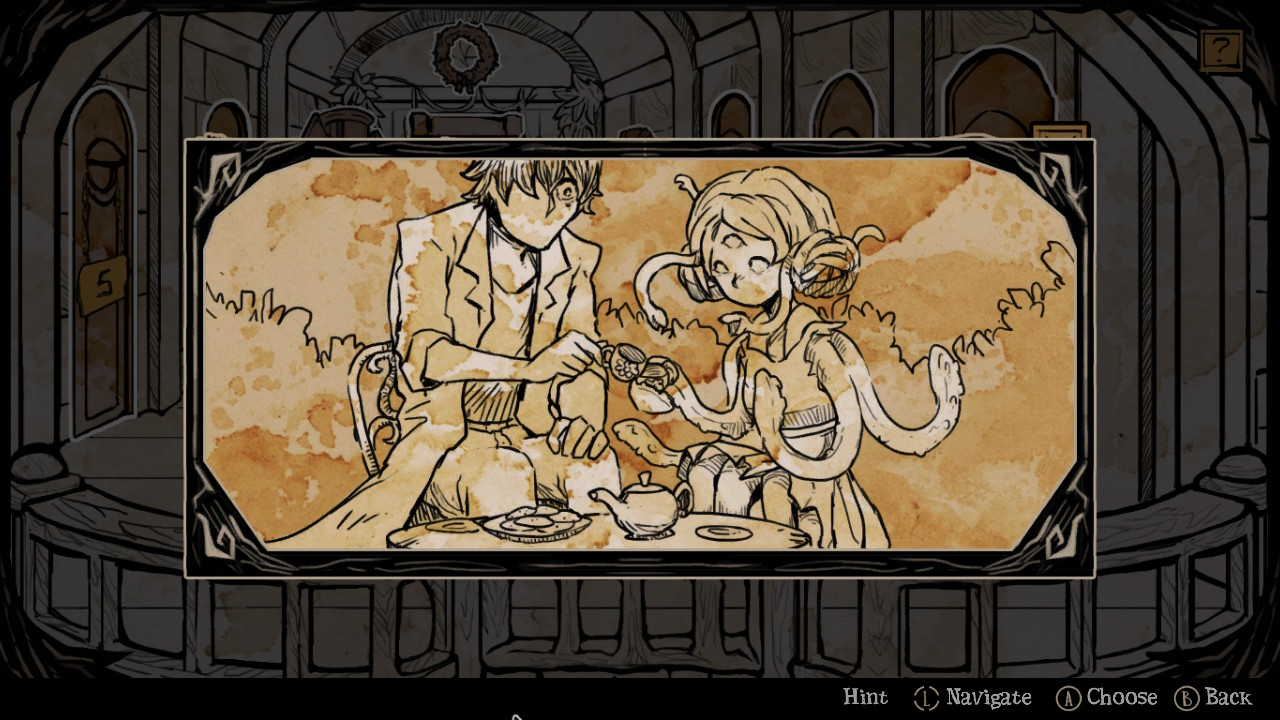 Dans la version Switch de My Lovely Daughter, le DLC de l’Inquisiteur est automatiquement fourni. Ce curieux personnage vous confiera diverses missions selon les skins de fillettes que vous aurez débloqués, toujours pour traquer un de vos voisins de Salach. Parlant en énigmes (pas bien compliquées, rassurez-vous, monsieur est bien loin du Père Fouras), ce sera à vous de débusquez la fille qui correspondra au mieux aux tâches qui vous seront confiées. Pas forcément transcendant, cet addendum fut ma foi sympathique, cassant un peu avec le rythme habituel de vos virées au village et vous permettant de découvrir un peu mieux les morbides personnages qui vous entourent : une fois la mission complétée, vous trouverez leur photo tamponnée d’un symbole rouge dans votre grimoire. Au fur et à mesure de l’histoire, vous vous rappellerez des bribes de votre passé qui seront narrées dans votre fidèle bouquin. Après chaque échec utile d’infusion de l’âme de votre fille vous débloquerez de mini-cinématiques, et selon vos choix, différentes fins seront disponibles. Compléter les quêtes de l’Inquisiteur vous donne droit à une cinématique exclusive mais qui ne fait qu’augmenter le suspense pour le dénouement de l’aventure. J’ai personnellement eu la « vraie » fin qui s’obtient, je suppose, lorsque notre relation avec chaque villageois est maximale.