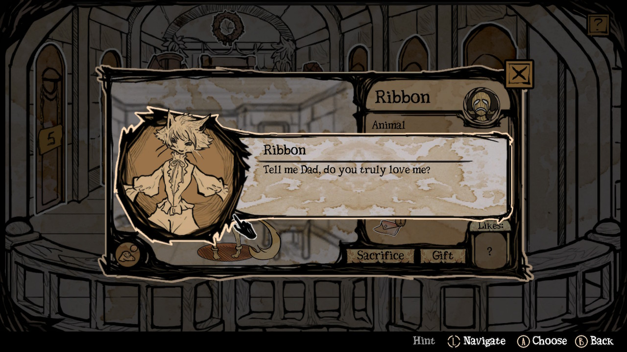 My Lovely Daughter vous placera face à des choix cornéliens, comme par exemple le fabriquant de jouets (qui a clairement un passé pédophile) qui viendra toquer chez Faust en plein milieu de la nuit pour lui demander d’acheter sa Doll car il ne pouvait plus se passer d’elle. Non seulement il proposera un bon prix mais surtout, refuser une demande d’un des villageois qui vient vous visiter vous fera perdre sa confiance. N’hésitez d’ailleurs pas à ne pas répondre à votre porte si vous êtes déjà en meilleurs termes avec un personnage, vous ne perdrez aucun point. Au fil de la partie, toutes ces petites attentions de la part de vos filles ou au contraire, les pleurs que l’on entend lorsque vous désirez les sacrifier, poussent le joueur à s’attacher aux personnages qu’il a créé et à se remettre en question en permanence. C’est pour cela que j’ai craqué pour un homoncule que j’ai nommé Ribbon et que je n’ai pas pu sacrifier de toute ma partie, ce qui m’a fait perdre un temps fou. D’ailleurs, en parlant de temps…