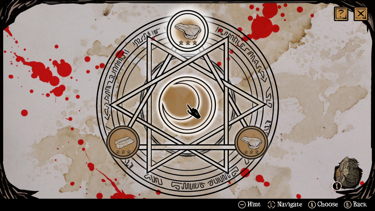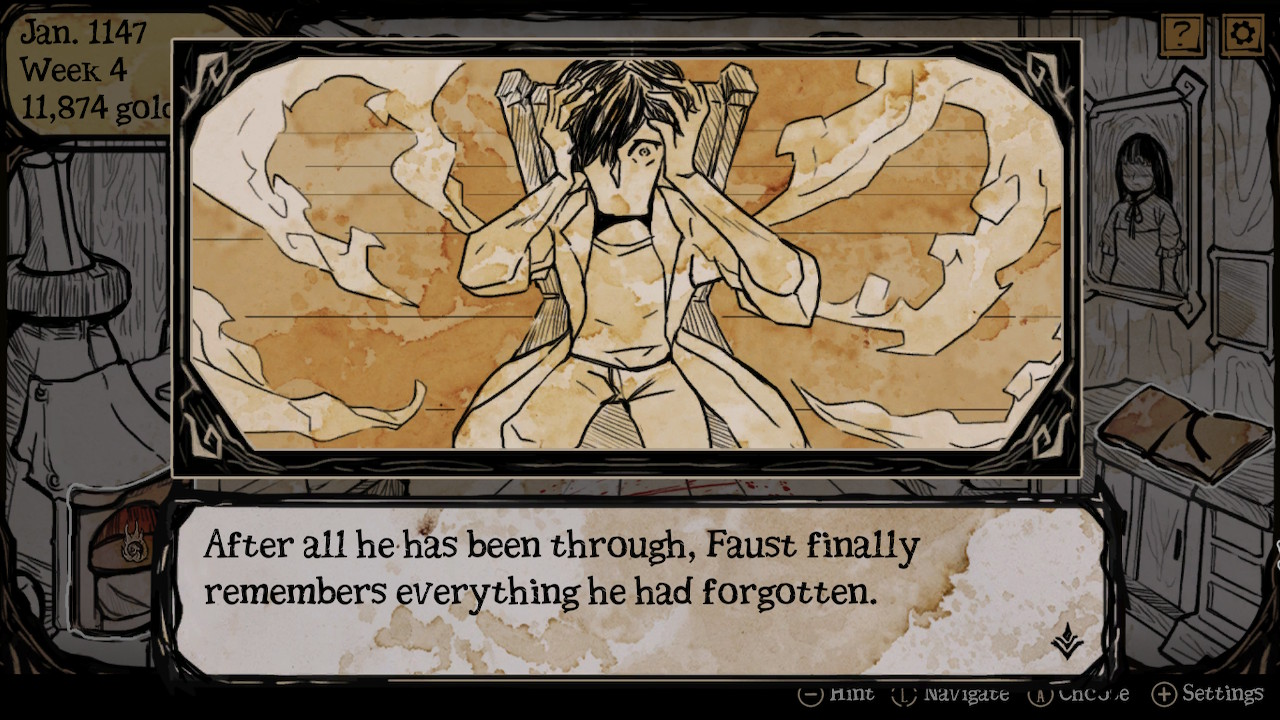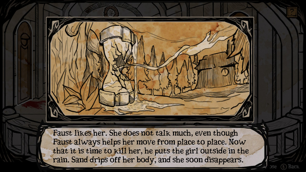 Pour rappel des faits, le jeu s’ouvre sur une séquence vous expliquant que vous êtes Faust, un alchimiste se réveillant amnésique et seul dans son manoir si ce n’est pour le cadavre de sa fille dans le lit. Je vous préviens immédiatement, cette scène est à l’image du reste du jeu: en fait, cela ne fait qu’empirer. Le grimoire magique de Faust sera votre outil le plus important, n’hésitez pas à le consulter régulièrement. C’est celui-ci qui vous informera notamment que pour ressusciter votre fille vous avez devoir sacrifier des homoncules. Je vous dois quelques explications : nous allons glisser dans le technique et je vais détailler les ficelles du mode de jeu qui peut s’avérer légèrement déstabilisant aux premiers abords. Prenez mon expérience comme un crash test et tirez de mes enseignements un guide, un compagnon dans votre propre quête, croyez-moi cela vous sera utile.