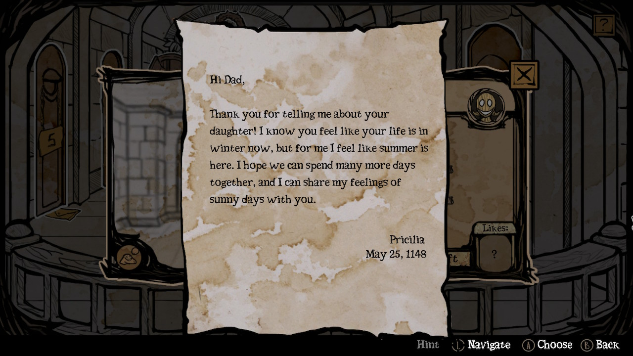 My Lovely Daughter vous proposera de personnaliser le nom de vos filles et a prévu, intelligemment, des prénoms préremplis au vu du nombre de meurtres que vous allez effectuer. L’affection ne sert pas seulement à faire grimper en niveau vos filles mais aussi, et c’est une partie bien plus sombre, à éviter que ces dernières ne s’enfuient de la maison. Chaque fille a sa propre personnalité et lorsque vous passerez du temps avec l’une d’entre elles ou que vous la tuerez, vous pourrez contempler des artworks personnalisés vous faisant découvrir quelle activité celle-ci préfère (comme jouer à cache-cache) ou la façon dont Faust a choisi de se débarrasser d’elle (faire fondre Ice, un homoncule de glace, par exemple). L’individualisme de vos créations se reflètent aussi dans les lettres que celles-ci vous laissent sous leur porte, j’ai particulièrement aimé celles de Mermaid qui finissent par avoir un double sens lubrique, mais cette idée n’est que très brièvement abordée (quitte à faire un jeu aussi tragique, autant chercher tous les pêchés capitaux).