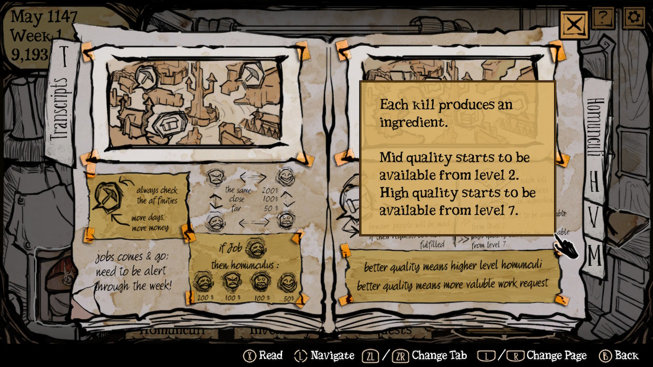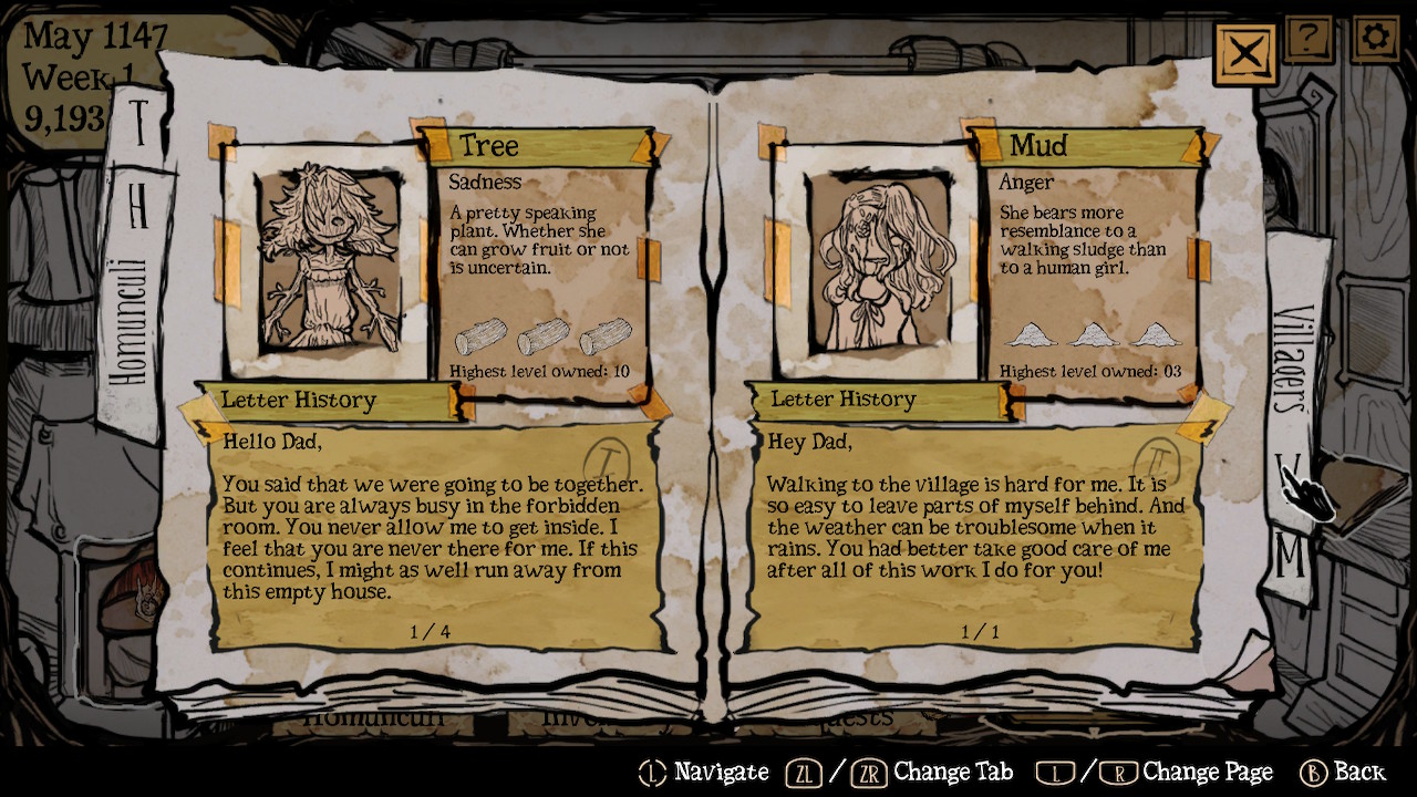 Tout d’abord, qu’est ce que sont que ces homoncules ? Et bien, tout simplement ce sont des êtres vivants à l’image de petites filles que vous créerez grâces à vos dons d’alchimiste. Au départ trois matériaux sont disponibles : bois, boue et eau, vous en débloquerez deux autres par la suite : viande et fer. Grâce à des combinaisons de trois ingrédients (dont deux identiques, sous peine de créer un homoncule défaillant), vous obtiendrez des filles qui auront chacune un trait de personnalité différent variant entre peur, colère, joie et tristesse. Au total, vous pourrez débloquer jusqu’à 26 filles (réutilisables) grâce à vos mélanges avec chacune une apparence différente, de quoi donner l’envie de les collectionner telles des Pokémon ! Il faudra ensuite faire monter le niveau de ces demoiselles pour finir par les sacrifier afin d’obtenir leurs âmes que vous pourrez, une fois par mois, transférer dans le corps de votre fille. Cependant, c’est un travail complexe car celle-ci possède un pourcentage sentimental très précis pour chaque émotion, ce qui vous forcera plus ou moins, lors des premières expériences, à faire du die and retry. Ne vous inquiétez pas, vos données ne seront pas perdues, au contraire, elles seront inscrites dans votre grimoire et consultables par la suite pour donner des paramètres d’infusion plus précis.