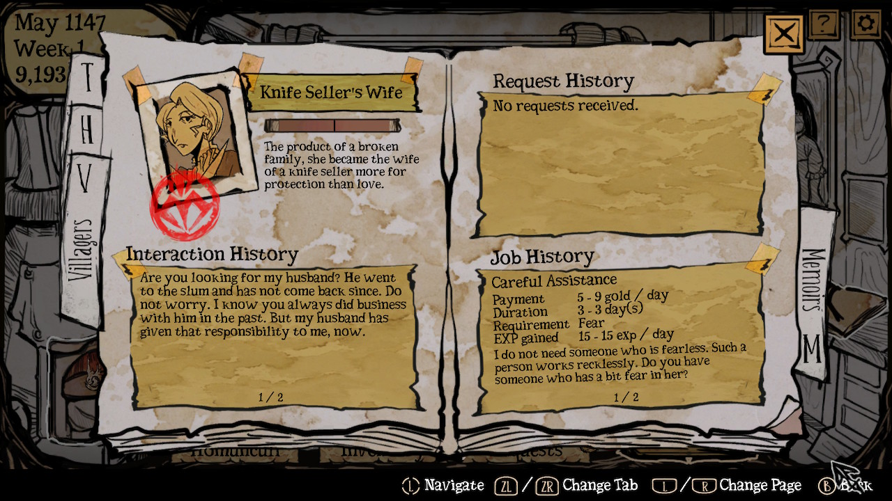 Cependant, ce ne sera pas la seule façon de monnayer vos filles, et pour cause, lorsque vous les sacrifiez vous récupérerez une partie des matériaux utilisée lors de leur construction et cette fois-ci avec une rareté variant d’une à trois étoiles selon le niveau et l’affection que votre homoncule vous portera. De plus, l’artefact Miroir de Mimicry augmente votre gain de matériaux lors d’un sacrifice. Une aubaine : ces nouvelles ressources vous permettront soit de créer une fille avec un niveau de départ plus élevé, soit de satisfaire les requêtes des villageois. Parlons-en immédiatement, lors de vos séjours au village les habitants vous proposeront parfois des missions alléchantes: quelques matériaux en échange d’un bon nombre d’écus. Si c’est bien la façon la plus profitable de se faire du pognon, attention à ne pas vendre la peau de l’ours avant de l’avoir tué : le pourcentage d’obtention de chaque matériau après un sacrifice est aléatoire et même si votre fille était composée à 100% de l’ingrédient qu’il vous faut, la rareté que celle-ci produira est aussi (à un certain degré) assez difficile à évaluer. Le revers de la médaille étant que chaque requête non complétée dans le temps imparti nuira à votre relation avec les villageois qui ont de véritables jauges de confiance consultables dans votre grimoire : ce sont donc des offres précieuses mais à utiliser de façon judicieuse.