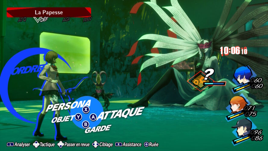Le vrai challenge des explorations du Tartare sera donc les combats de boss, demandant plus de stratégie, mais aussi la gestion des points de magie, que l’on ne pourra recharger que via des objets assez rares (bien qu’un peu plus faciles à obtenir dans Persona 3 Reload que dans le cinquième épisode). Car, une fois la jauge de magie vidée, vous n’avez d’autre choix que de rentrer chez vous vous reposer, tant les combats ne sont pas pensés pour être terminés uniquement via des attaques physiques. Bien entendu, vous pouvez retourner au Tartare autant de fois que possible, mais comme d’habitude dans Persona, la méta est d’explorer au maximum en une seule nuit – vous pouvez même y aller une seule fois par mois, en vous débrouillant bien – afin de ne pas perdre du temps qui pourrait être consacré à augmenter vos stats ou les liens sociaux avec vos amis. À vous donc de choisir intelligemment quand et comment attaquer, mais aussi d’explorer consciencieusement les étages à la recherche de coffres pouvant contenir les précieux objets vous permettant de recharger votre précieuse barre jaune.
