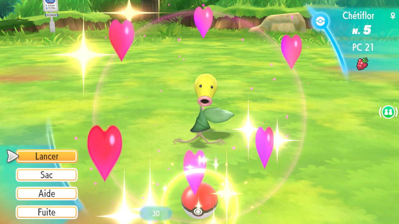 Impossible de ne pas s’arrêter sur cette évolution de gameplay. Apparue avec la sortie de Pokémon GO, le système de capture sur Let’s Go est presque identique à celui sur le jeu mobile. Jusqu’à maintenant, la capture des Pokémon était simplement l’utilisation des PokéBall durant un combat au tour par tour, et ce depuis les premières versions. En fonction de la PokéBall utilisée, le taux de capture variait alors, et tout était question de chance, ou presque. Pour capturer facilement un Pokémon adverse, il fallait l’affaiblir, et lui infliger un statut pour maximiser ce taux de capture. Dans les dernières versions de la saga principale, la capture rapporte des points d’expérience, et vous permet de gagner quelques niveaux, mais la source principale d’expérience restait les combats. Sur Pokémon GO, il fallait utiliser l’écran tactile pour lancer des PokéBall en rafale, et à la place de la barre de PV, un cercle apparaissait au niveau du Pokémon, en même temps que ce dernier bougeait. Plus le cercle était petit, plus la capture était probable et facile, et là aussi les bons lancers vous rapportaient de l’expérience, mais le système de jeu était tellement différent de la saga principale que ça n’était pas vraiment comparable.