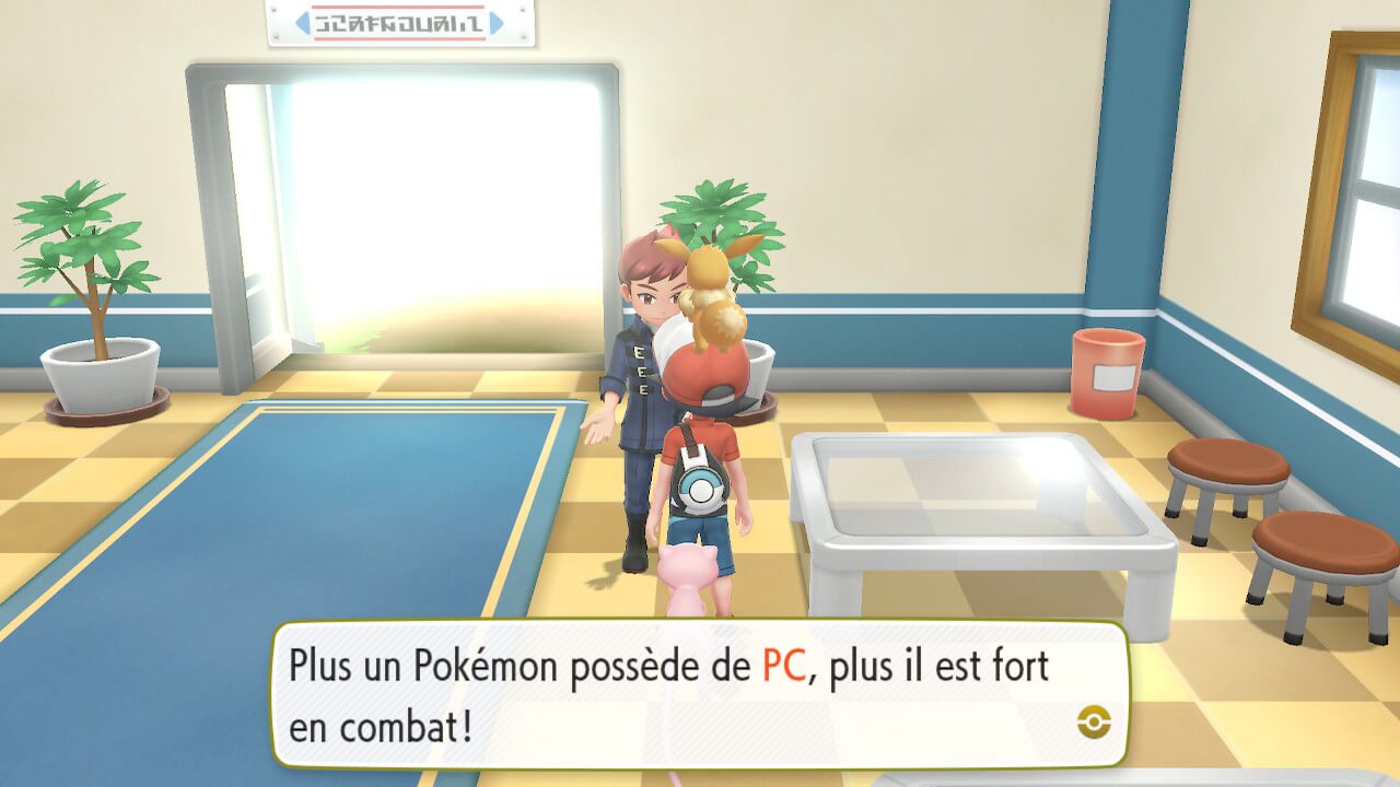 Pour les anciens joueurs, il faudra faire preuve d’ouverture d’esprit sur pas mal de points. Le côté mignon du jeu a en effet pris la grande part du gâteau, et ça sera assez lassant de voir autant d’assistance pour un jeu qui à la base déjà plutôt accessible. Par exemple, il vous sera impossible de rentrer dans l’arène d’Argenta sans avoir sur vous un Pokémon Plante ou Eau. On peut aussi citer la grosse simplification des menus, comme la possibilité d’avoir plus de 6 Pokémon sur vous, ce qui rend le jeu beaucoup plus simple stratégiquement. Un des points les plus flagrants est peut être le fait que vous gagnez la majorité de votre expérience en capturant des Pokémon, mais nous y reviendront un peu plus loin. En tant qu’ancien joueur, il m’a fallu dès le départ voir Pokémon Let’s Go comme un jeu à part, tant les possibilités et les outils proposés étaient moins nombreux que ceux disponibles sur les versions classiques, mais passé ce cap là, vous vous rendrez compte que Pokémon Let’s Go est un jeu pouvant concerner aussi les joueurs de niche, et nous y reviendrons un peu plus tard.