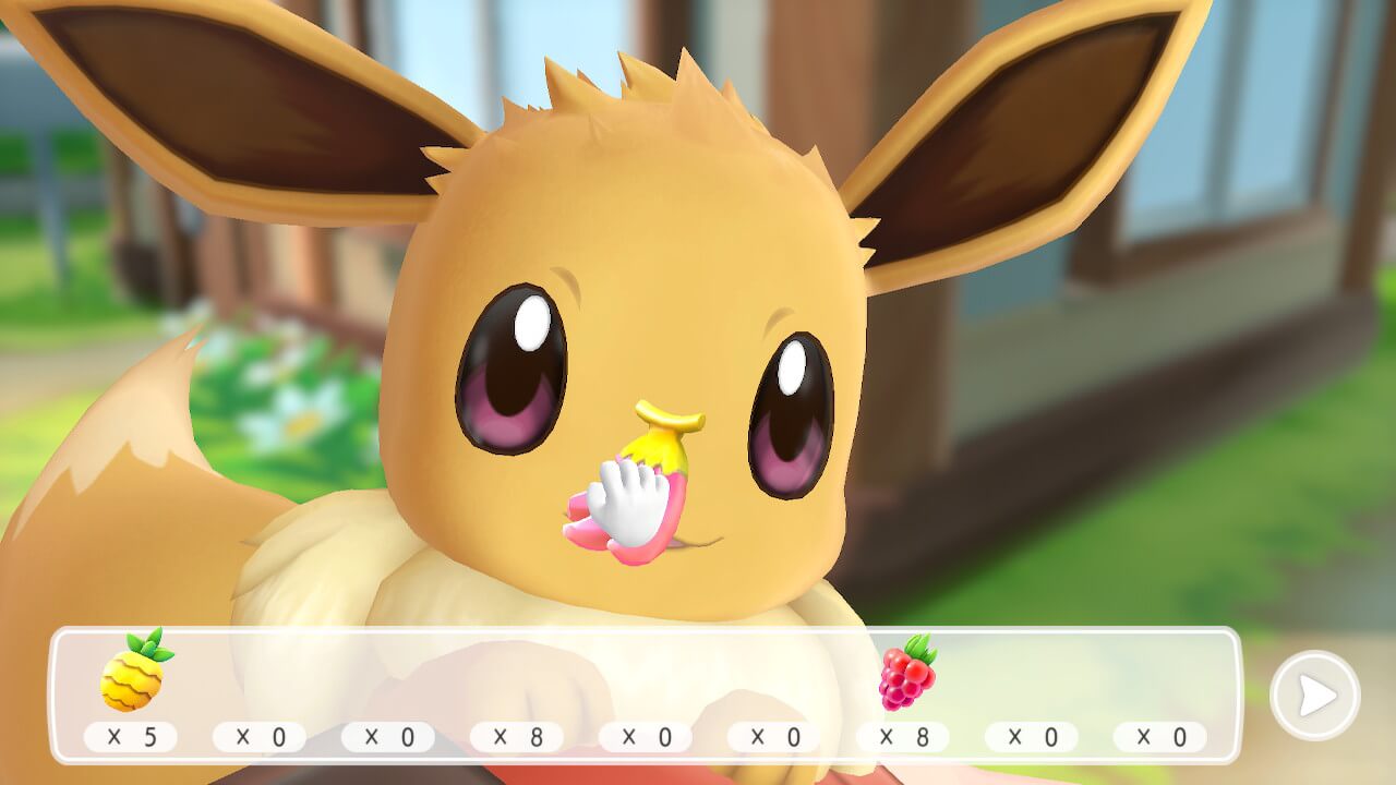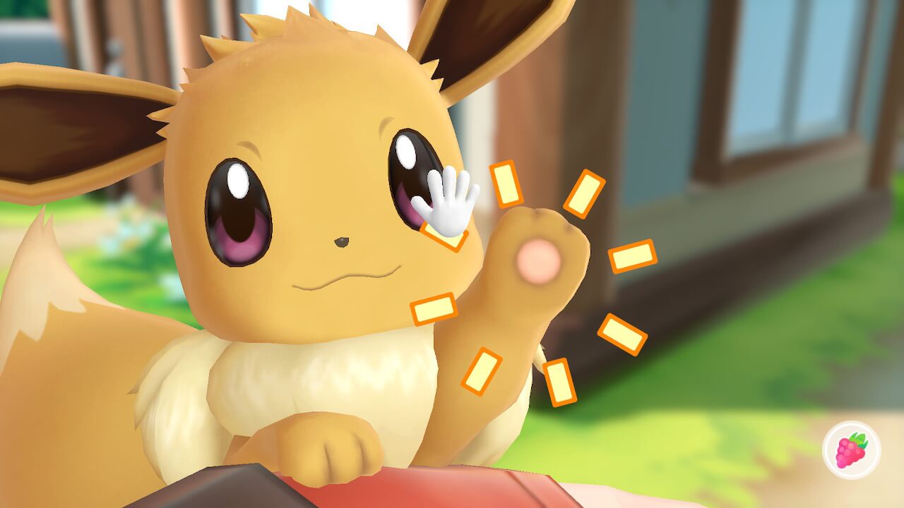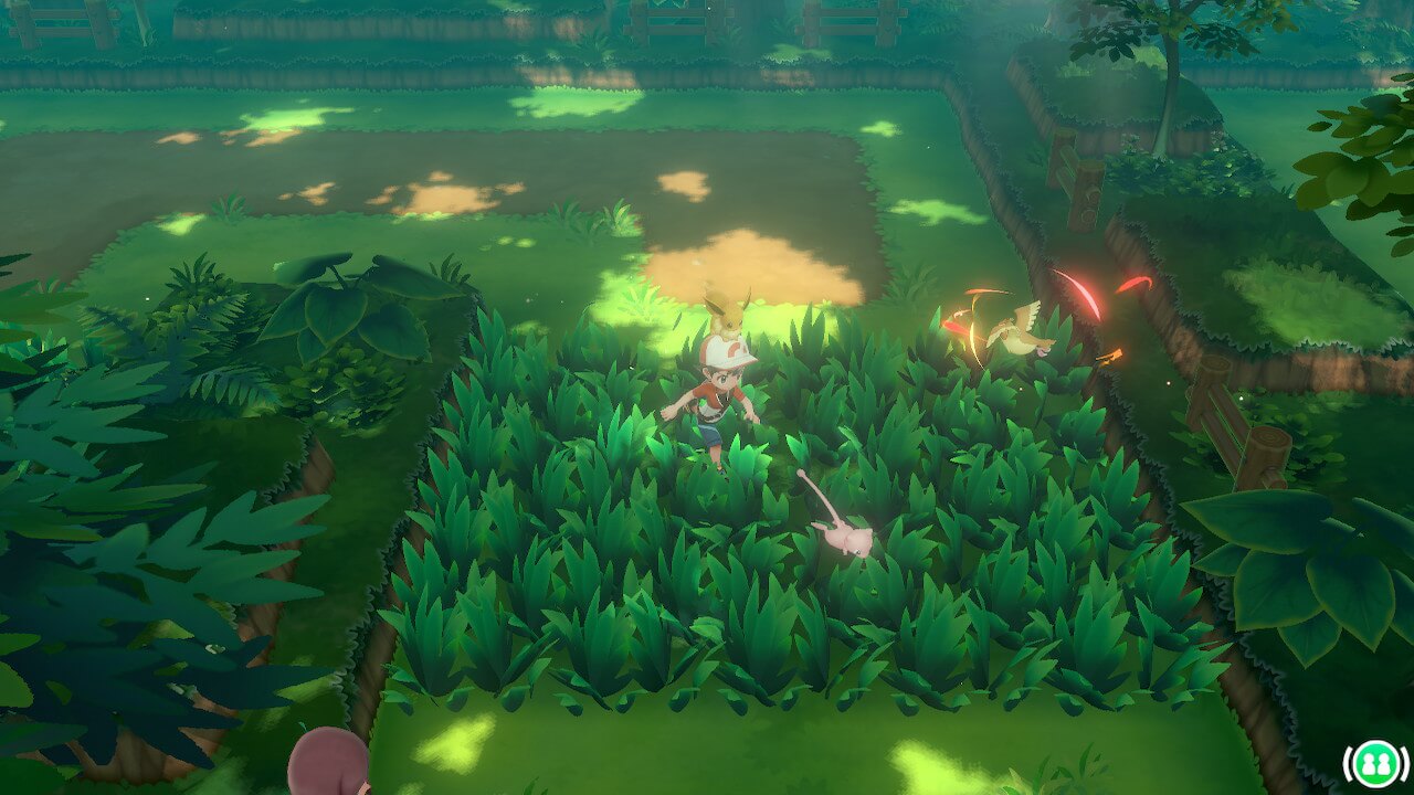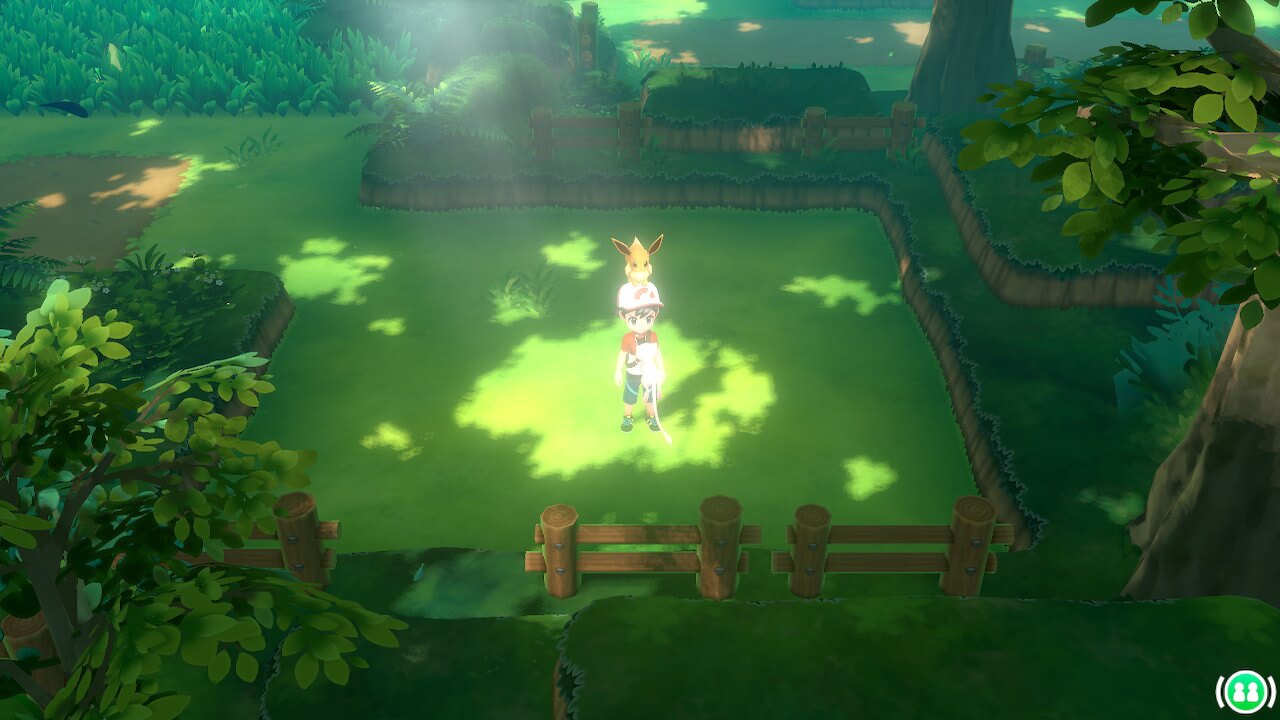 Dans Let’s Go, on ne sent aucun plafond de verre concernant la représentation de l’univers Pokémon : c’est tellement satisfaisant et soulageant de voir des Roucool voler dans les herbes alors qu’on se balade tranquillement, et de voir tous ces Pokémon vivre dans chacune de leur expression. Mention spéciale aux animations des Pokémon, notamment à celles d’Evoli et Pikachu, qui décrochent la palme de la « mignonesse ». Pikachu (et Évoli par la même occasion) est enfin ce qu’il a toujours été dans l’animé mais bien trop peu dans les jeux : un vrai compagnon de route. Bien sûr, Pokémon Jaune laissait déjà entrevoir cet aspect là, mais ici on a vraiment la sensation de faire corps avec son Pikachu/Évoli. Une interface est même prévue spécialement pour interagir avec son Pokémon partenaire, afin de le caresser et de lui donner à manger différentes baies. Il ne quittera plus votre casquette, et le jeu offre aussi d’autres spécificités liées à ce Pokémon très spécial. Par exemple, il est possible de l’appeler en combat par moments, afin d’obtenir un bonus de statistiques sur le Pokémon envoyé au combat. La PokéBall Plus participe aussi à cette relation dresseur/Pokémon partenaire en proposant au joueur de partir, une fois le jeu éteint, avec son Pokémon dans sa poche ! Il est possible de le faire avec n’importe quel Pokémon, mais le Pokémon partenaire est mis en évidence lorsque le joueur désire utiliser cette fonction, ce qui montre la mise en valeur de Pikachu et d’Évoli et toute l’importance de la relation dresseur/Pokémon partenaire au sein du jeu.