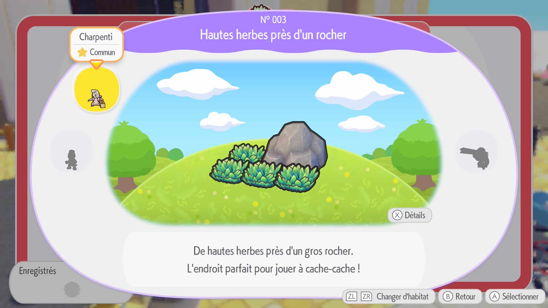 Il est très amusant de concevoir une large diversité d'habitats, non pas pour “tous les attraper”, mais cette fois plutôt pour se lier d'amitié avec tout le monde. Heureusement, il ne faudra pas faire des habitats à l'aveuglette : des “traces” de Pokémon pourront être inspectées fréquemment, dans le but de connaître ce dont a besoin une créature en particulier. Ces indices seront à retrouver dans notre “Habitadex” présent sur le Pokédex de Métamorph.