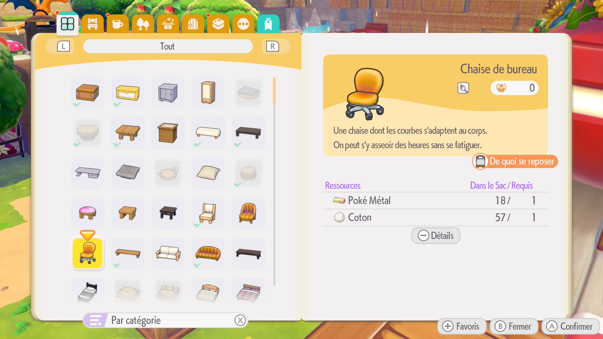 Par ailleurs, la variété d'objets mise à disposition du joueur est organisée en plusieurs catégories, à l'image des blocs qui seront, pour la plupart, classés comme “de quoi circuler facilement”, ou encore des objets conçus à base de fleurs classés comme “de quoi décorer”. Ces groupes d'objets répondent à plusieurs demandes et permettent aussi de savoir plus facilement ce dont a besoin un Pokémon pour améliorer son confort. Enfin, puisqu'il est possible de bâtir des maisons, pourquoi ne pas en profiter pour faire emménager nos amis dedans ? Les Pokémon pourront s'installer à plusieurs dans ces logements qu'ils ont eux-mêmes construits, permettant un gain de place, mais aussi d'améliorer leur confort plus rapidement en décorant l'intérieur de la maison.