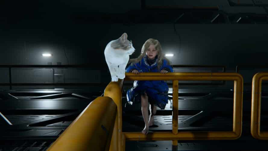 S'il faut saluer Pragmata sur un point, c'est Hugh. Ici, le jeu ne tombe pas dans le piège du quarantenaire bourru, qui s'agace à chaque parole de la gamine qui l'accompagne, et qui est abject avant de finalement s'adoucir au fil du récit. Non, Hugh est un homme bienveillant avec Diana du début à la fin. Toujours avenant avec elle, il répond à ses questions avec joie et lance régulièrement la conversation. Une dynamique agréable, qui par conséquent peine à évoluer, mais qui fait du bien dans un paysage vidéoludique du AAA ou les darons désagréables ont la côte (Kratos, Joël, on vous parle !). On finit presque par s'attacher à la philosophie de comptoir dans laquelle il nous emmène lorsqu'il raconte des pans de sa vie sur Terre. Diana de son côté est mignonne comme une enfant. Pleine de curiosités, de questionnements, de soif d'aventures, s'émerveille d'un rien… On oublie presque au fil du récit qu'elle est un robot.
