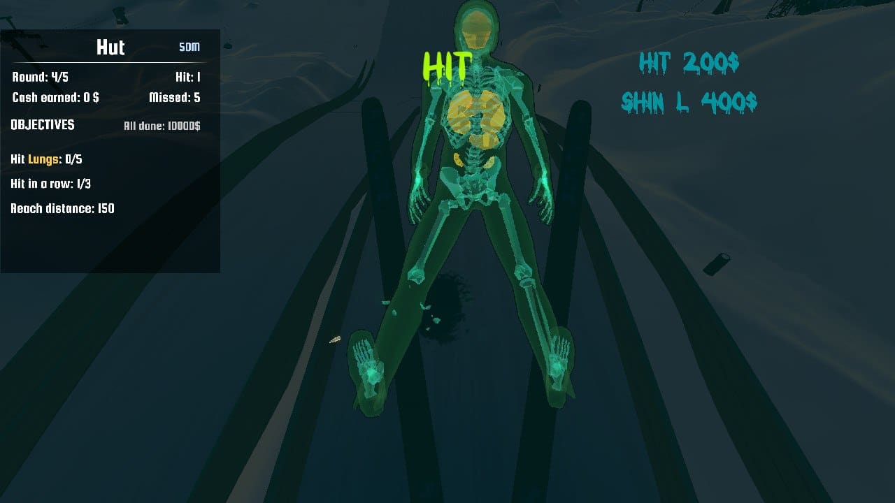 Mais venons-en au cœur du gameplay de Ski Sniper : en effet, celui-ci vous demandera de shooter des participants à une épreuve de saut à ski entre le moment où ils décolleront de la piste et le moment où ils atterriront. Pourquoi une telle restriction ? Nul ne le sait, mais il s'agit sans aucun doute d'un moyen d'augmenter encore l'impression de réalisme que le titre porte fièrement en étendard. Reste que toucher ces sauteurs à ski s'avère extrêmement dur, même en utilisant la commande destinée à couper notre respiration : notre fenêtre de tir est extrêmement réduite et vous devrez donc être rapide afin de toucher votre cible. Comme les plus grands (Cuphead, Super Meat Boy…), Ski Sniper emprunte aux dynamiques du die and retry, pour notre plus grand plaisir. Certes, seul un tir sur vingt finit par atteindre sa cible, mais la satisfaction de les avoir dégommé n'en ressort que plus grande.