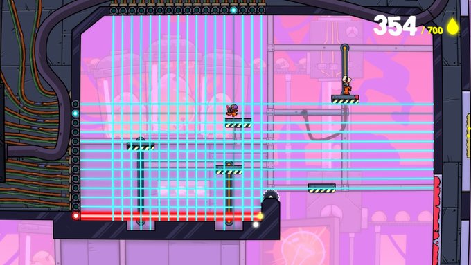 Nous voici donc directement plongés dans le premier niveau du jeu. Ici, pas de difficulté particulière : il s'agit d'appréhender le gameplay en douceur en appuyant sur un seul bouton (le bouton B) pour sauter de plateforme en plateforme, ainsi qu'attraper les « Pièce-Goutte » (700 par niveau), délivrant alors le dernier employé. Cette approche est nécessaire car Splasher exige une précision chirurgicale et est sensible à la moindre de vos commandes : un temps d'adaptation est à prévoir pour maîtriser la physique du jeu, cette dernière s'avérant légèrement étrange au début mais pas d'inquiétude, on s'y accommode rapidement. Une fois que les bases sont apprises, il vous est offert différents éléments de gameplay, et ce tout au fil de votre aventure : ils vous permettront d'interagir avec l'environnement par des mécanismes particuliers. Tout d'abord, vous pourrez projeter de l'eau avec votre « arme » (bouton Y) qui déclenchera certains dispositifs et éliminera les ennemis les plus faibles. Ensuite, avec le bouton A, vous pourrez balancer de la peinture rouge à tout-va (les fans de Splatoon tels que moi en sont ravis) pour gravir les murs ou immobiliser les ennemis. Enfin, il vous sera possible de jeter de la peinture jaune (bouton X), vous permettant de rebondir pour atteindre les sommets.