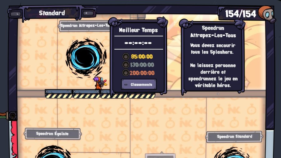 Splasher est un jeu que vous pouvez évidemment faire sans vous casser la tête, en faisant 1 ou 2 niveaux de temps en temps. Mais il est aussi parfaitement taillé pour le speedrun : pour les plus compétitifs d'entre nous, il existe un mode où vous pouvez faire l'intégralité des niveaux en une seule fois le plus vite possible. Vous avez le choix : soit vous optez pour un vrai speedrun, dit égoïste (pas de sauvetage des employés, seule la vitesse prime), soit pour un speedrun standard ou encore un speedrun « Attrapez-les tous ! » dans lequel vous devrez finir le jeu à 100% le plus vite possible. Vous pourrez ensuite comparer vos temps avec ceux du monde entier, et on ne manquera pas de constater que certains joueurs ont des records hallucinants : il faut connaître le niveau par cœur et maîtriser pleinement les jets de peinture ou d'eau. En résumé, un mode idéal pour les tryharders qui veulent se dépasser (et surtout adorent le jeu), ainsi que pour prolonger la durée de vie du jeu ! Vous pouvez bien évidemment tenter de battre votre record de temps par niveau pour atteindre le 100% en sélectionnant le mode Contre-la-montre au lieu de Standard dans l’Inkorp Hall.