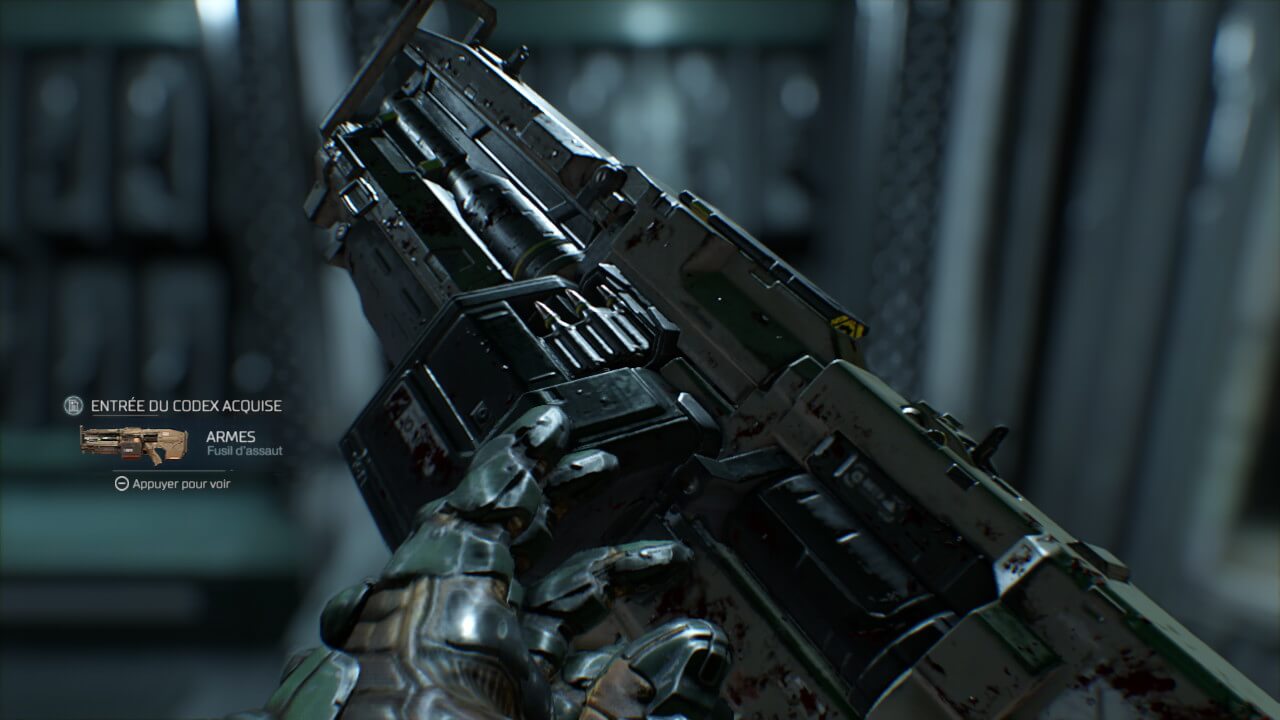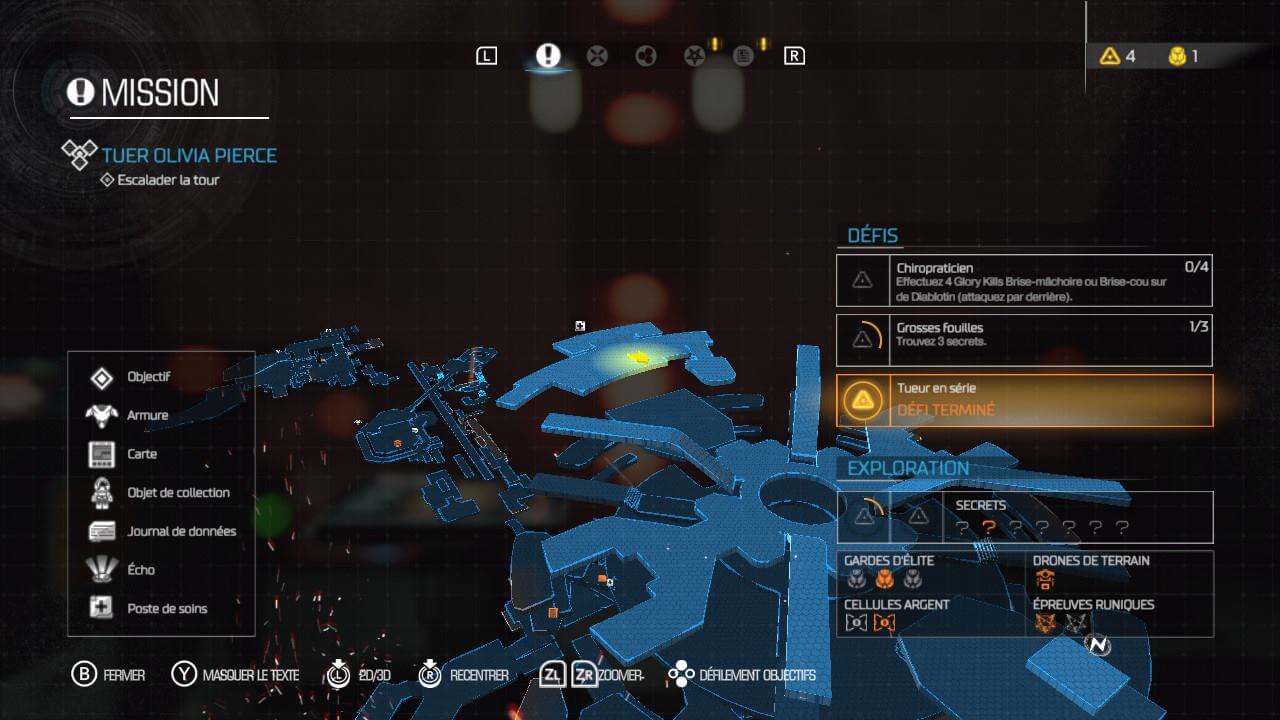 Pour pallier à cela, vous pouvez tout au long de l’aventure récupérer des armes, les améliorer et augmenter votre armure. Pour les armes, chacune d’elle possède son tir principal, puis au choix deux tirs alternatifs. La première arme, après l’arme de poing, est un shotgun (un fusil à pompe). En rencontrant un petit robot, trouvable plus ou moins facilement dans chaque zone, vous pourrez choisir si vous souhaitez avant tout débloquer le module » rafale « , permettant de tirer plusieurs coups rapidement ou le » tir explosif « , qui permet d’envoyer un tir de mortier explosif. Chaque module possède 4 améliorations, à débloquer avec des jetons d’arme que vous pourrez récolter en jouant. Chaque arme possède donc deux modules, permettant au fur et à mesure de varier les plaisirs. Il n’est cependant pas simple de switcher entre plusieurs armes, encore moins entre deux modules. Dans des combats aussi rythmés que dans DOOM, nous ne pensons pas forcément à utiliser la roue d’armes (bouton R) pour changer d’équipement. Concernant l’armure, nommée Praetor, il ne faudra pas éliminer des ennemis, mais trouver des gardes d’élites. Il s’agit ni plus ni moins de gardes tués, sur lesquels vous récupérerez une sorte de carte mémoire, qui est en fait un jeton. Vous pourrez choisir entre améliorer votre résistance à l’environnement, la technologie cartographe (lol), le système d’équipement, l’efficacité des pouvoirs et la dextérité. Comme les armes, toutes ces améliorations possèdent des sous-améliorations.