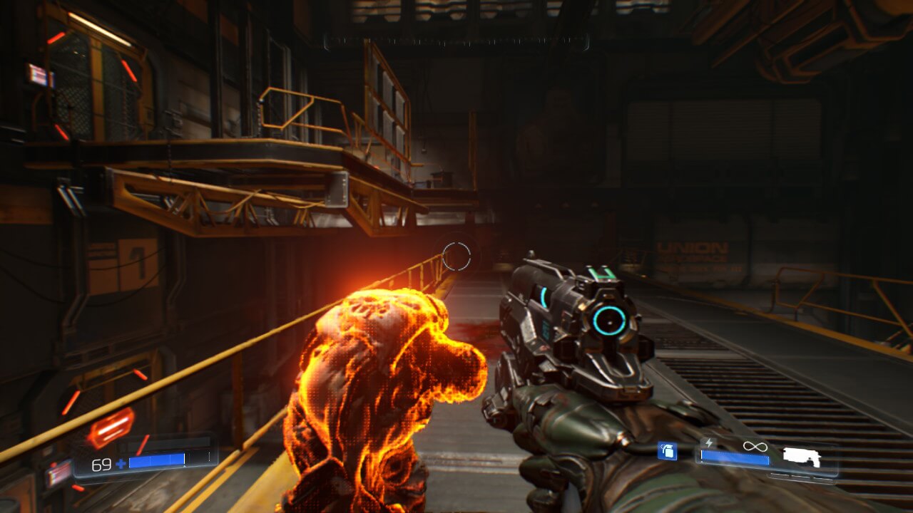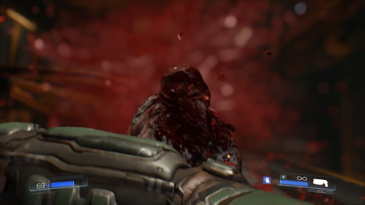 Tout d’abord, le premier lancement du jeu va vous faire tout drôle : le jeu est très flou, encore plus en mode portable. On pourrait croire à un soucis technique, ou à des lunettes cassées, mais non. Certains éléments de gameplay (comme des écrans dans le jeu par exemple) sont, eux, bien nets, dans un univers flou. L’oeil s’y habitue, mais ça peut faire un petit choc au départ. Il faut également penser à baisser ou retirer le flou cinétique, qui est étonnamment fort de base, et crée une très étrange sensation lors des mouvements de caméra. La fluidité du titre quant à elle est présente … mais pas tout le temps. Dans la majorité des cas, vous ne rencontrerez pas de soucis de fluidité dans DOOM sur Nintendo Switch. Mais à chaque zone un peu trop grande et trop remplie de monstres, vous verrez les 30 fps du jeu se transformer en 25 fps, voire moins encore. Cela casse un peu l’ambiance de ce jeu très rythmé de base.
