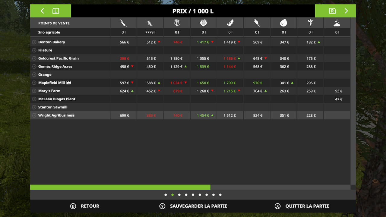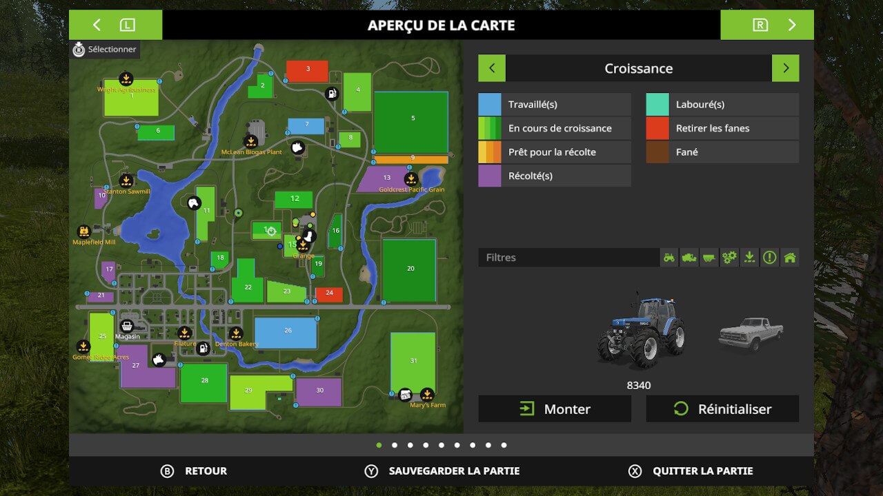 Parce que je ne saurais pas réellement ou classer tout cela, nous parlerons ici de diverses choses à savoir sur Farming Simulator Nintendo Switch Edition. Le menu pause du jeu vous permet d’avoir accès à beaucoup d’informations. D’une part, la carte du jeu. Celle-ci vous permet de savoir quelle culture est plantée dans quel champ, mais également la croissance de chacune de ces cultures avec les différentes étapes. Pour pourrez également vous téléporter à différents endroits, mais sans vos véhicules (ça serait trop facile !). Avant de vendre une récolte, consultez le tableau des prix. Sur celui-ci, chaque point de vente est listé, avec les prix pour chaque culture ainsi qu’une idée de si le prix est entrain de monter ou descendre. A savoir qu’un des points de ventes n’est disponible que pour les ventes en train, car oui, vous pouvez transporter vos cultures avec l’un de vos deux trains (ceux-ci sont gratuits et ne demandent aucun entretien). L’écran suivant concernant vos véhicules, leur temps d’utilisation et ce qu’ils vous ont coûté en tout. A savoir que plus un véhicule est ancien, plus il perdra de la valeur. Viennent ensuite les finances, vous informant de l’état de vos comptes sur les 4 derniers jours. Si vous avez des animaux, l’écran d’après vous informe de tout ce qui est à savoir dessus : le nombre d’animaux, leur productivité, le taux de reproduction, la propreté de l’enclos, l’eau et la nourriture. Par la suite, vous avez accès à vos statistiques avec entre autres les hectares travaillés, le temps de travail des champs, la consommation d’engrais et le temps de jeu. En plus des paramètres du jeu, vous avez accès comme dit avant à l’assistance.