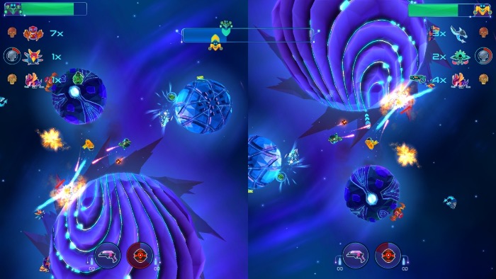 Fatalement, les shooters 2D sont tous menacés par la répétitivité souvent retrouvée dans le genre. Robonauts n’y échappe malheureusement pas, et à plusieurs niveaux. Bien que des versions améliorées de votre fusil et de vos grenades arrivent régulièrement, ils ne parviennent pas à gommer la désagréable impression que le titre vous amène à réaliser les même actions jusqu’à activation du téléporteur de sortie, marquant la fin du niveau. Le manque de plasticité des mouvements permis par le jeu laisse un sentiment de déception d’autant plus marqué que l’on peut aisément penser qu’un simple système de guidage de vos tirs aurait pu améliorer les choses. Car oui, vos tirs se contentent de se diriger vers l’ennemi le plus proche : un fait fort ennuyeux quand vous vous retrouvez cernés part l’ennemi et que la cible que vous atteingez n’est en aucun cas la cible voulue ! Ceci rejoint le déséquilibre dans la difficulté globale du jeu que nous citions précédemment. En revanche, un peu de piment s’invite dans vos croisades avec une diversité d’objectifs à accomplir qui parvient à atténuer quelque peu le sentiment de répétitivité (protéger des structures, des personnages, éliminer tous les ennemis etc…). Ajoutons à cela un mode coopératif optimal qui vous permet aisément de partager une partie avec vos proches, et vous aurez bien évidemment la possibilité de vous amuser sur Robonauts.