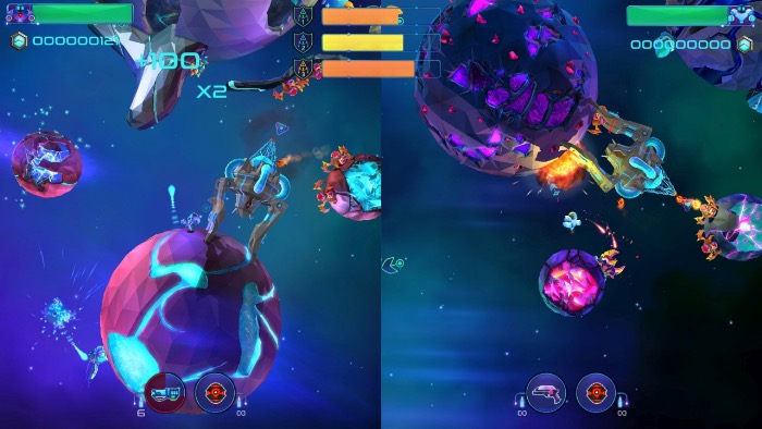 Un atout indiscutable de Robonauts est son ambiance générale très bien ficelée. À travers une superbe direction artistique aussi colorée que détaillée et accompagnée d’une bande-sonore fort sympathique signée Simon Viklund (PayDay, Payday 2, Tom Clancy’s…), on est immédiatement transporté dans l’atmosphère du jeu. Les contrastes et gammes de couleurs, mis en valeur par des jeux de lumière savamment mis en place donnent à l’ensemble un rendu aussi doux qu’épuré : un régal pour nos yeux ! De plus, Qubic Games a veillé à ce que son titre soit techniquement optimal avec une fluidité à toute épreuve, essentielle dans ce type de jeu. Le studio polonais tient là une très belle vitrine de ses compétences artistiques qu’on ne peut que féliciter. On retient également l’idée astucieuse de la gravité, cœur du gameplay imaginé pour le titre. Comme dit plus haut, chaque niveau contient nombre de planètes envahies de monstres : il vous est permis de passer d’une planète à l’autre d’une simple pression du bouton X à l’approche l’une d’entre elles. Très bien amené, le changement de gravité qui en résulte est effectué en douceur avec la fluidité qui caractérise Robonauts : de quoi avoir la tête dans les étoiles !