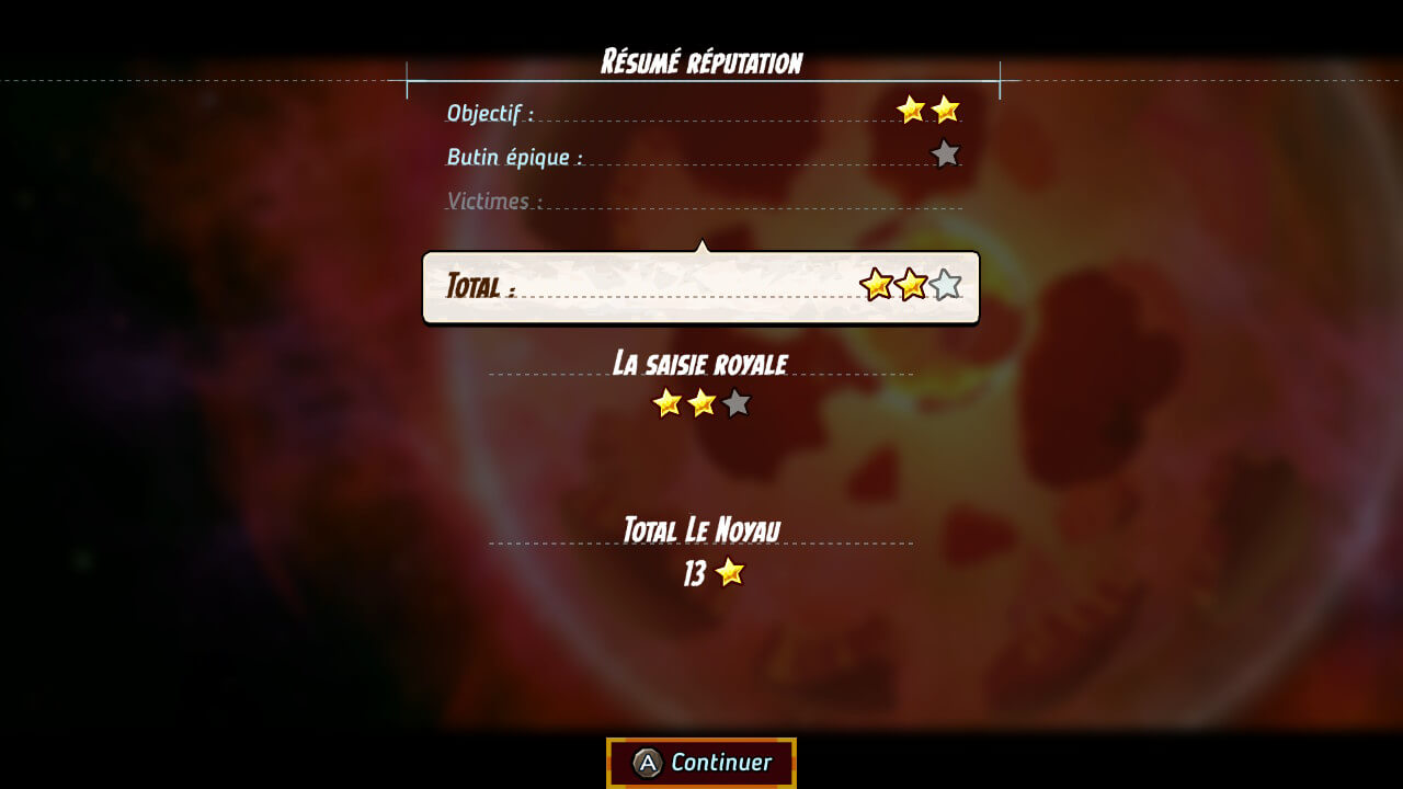 Pour finir, une fois la mission terminée, le jeu vous propose donc de regrouper vos membres d’équipage au même endroit. Une fois ceci fait, avec les membres restants, il est temps de collecter vos butins. Si besoin, vous êtes forcés de vendre un ou plusieurs objets afin d’accueillir les nouveaux. Viennent les moments les plus intéressants. Tout d’abord, le résumé de réputation. C’est ici que vos étoiles sont récoltées et comptabilisées. L’objectif de la mission est rappelé, en détaillant rapidement si une étoile était réservée à un butin épique, à un nombre de victimes, ou autres. Vous savez donc combien d’étoiles vous gagnez, et combien vous en avez en tout pour la zone de jeu. C’est au tour de l’expérience de s’afficher. Pour chaque mission réussie, vous gagnez un taux d’expérience divisée par le nombre de membres d’équipages restants. Dès que vous montez de niveau, le membre gagne une aptitude pouvant être un point de vie en plus, un bonus de puissance pour les équipiers alentours, un nouveau type de tir, un plus grand déplacement, etc. Ça y est, votre mission est terminée.