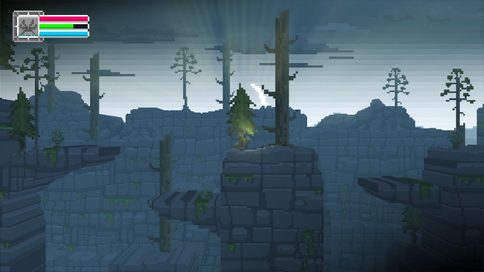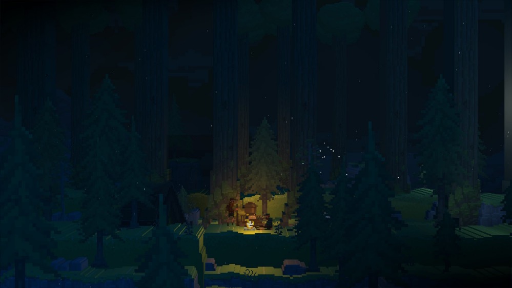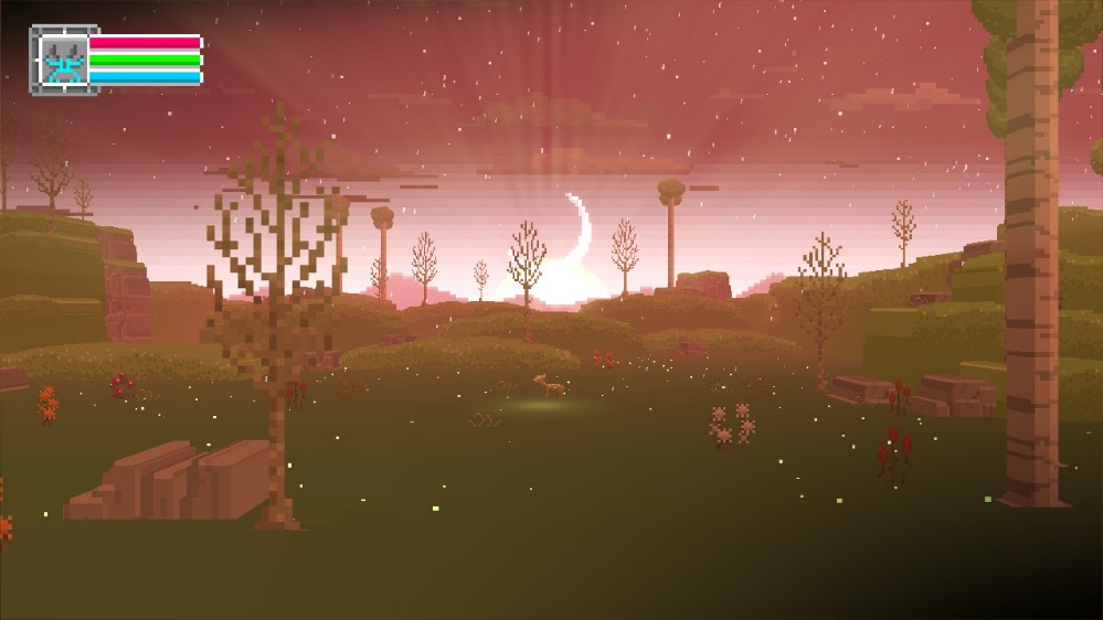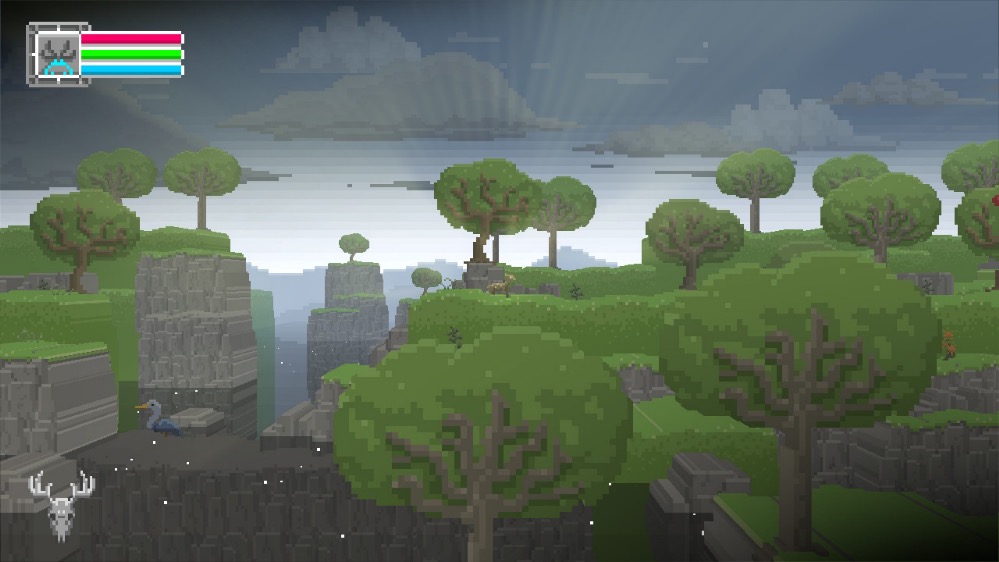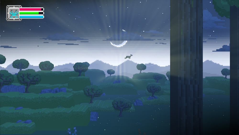 C’est après la prononciation de cette sentence divine que commence The Deer God. Le joueur se retrouve plongée dans un splendide univers tout en pixel dont la beauté rappelle avec plaisir le fameux concept de « 2D HD » vanté par Square Enix pour son titre Project Octopath Traveler. Avec ses couleurs chatoyantes et ses jeux de lumière apaisants, le titre de Crescent Moon parvient à créer une atmosphère zen tout à fait appréciable. On alterne avec plaisir divers environnements qui flattent l’oeil et charment le joueur. Un ressenti qui persiste malgré les multiples dangers qui guettent notre frêle cervidé car maintenant que vous êtes une proie, vous devez agir en conséquence pour ne pas vous faire dévorer par les loups, les renards et toutes sortes de prédateurs, animaux ou humains, qui rôdent aux alentours. Pas de panique cependant, les Anciens veillent sur vous : ces figures d’autorité de la harde de cerfs régnant sur la forêt viendront régulièrement vous aider en vous enseignant de multiples capacités, indispensables pour que puissiez faire pénitence.