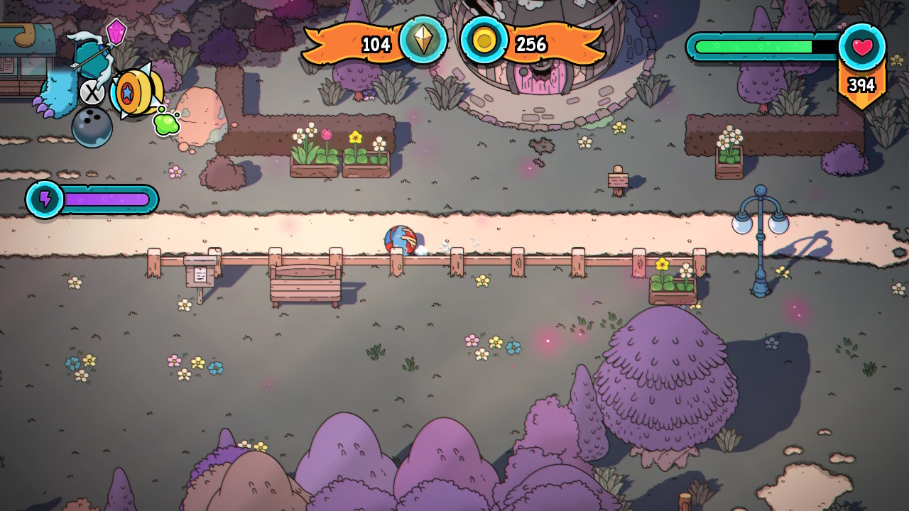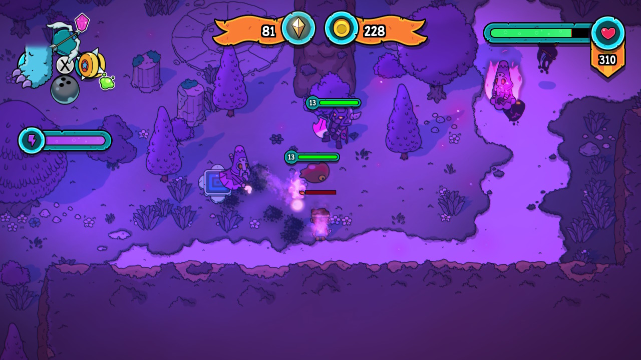Le nombre d’activités proposées dans Swords of Ditto : Mormo’s Curse s’élève au nombre de trois. Tout d’abord, l’essence du jeu repose sur les combats, pour ceci, le titre édité par Devolver Digital se base sur deux catégories d’armes. En premier lieu, l’arme que vous incarnez : cette dernière fonctionne de manière très classique au corps à corps, faisant des dégâts en fonction du niveau de votre personnage. Un système de combo très simpliste est également de la partie, il se présente sous la forme d’un enchaînement de trois coups permettra d'asséner un puissant coup critique à votre adversaire. Pour ajouter un peu de mouvement, vous disposez d’une roulade permettant un déplacement plus rapide autour de l’ennemi et même de vous rendre invincible pendant la courte durée de cette dernière. Notons que cette épée et le niveau qu’elle possède seront l’une des seules constantes au fur et à mesure de vos runs.
