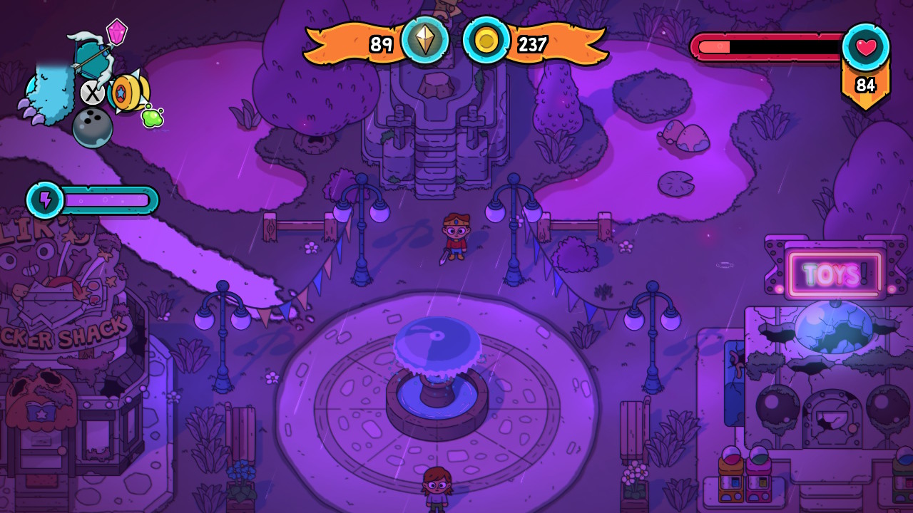 En plus de cette épée, vous disposerez d’un arsenal de jouets diversifiés au possible. Dans The Swords of Ditto, les jouets sont en vérité des armes telles que, par exemple, un arc. Notons que l’utilisation de ces objets consomme de l’énergie qui se régénérera en quelques instants. Comme précisé plus tôt, ces jouets se récupèrent dans un premier temps en terminant des donjons – vous y récupérerez des objets tels qu’un drone, un club de golf ou encore un disque servant de boomerang. En plus de servir en combat, ces jouets vous permettront de résoudre les énigmes des donjons. L’utilisation de cet arsenal d'armes s’effectue via un menu rapide. Il est possible d’assigner les jouets de votre choix à l’un des quatre boutons de la croix directionnelle, il vous sera alors aisé de passer de l’un à l’autre. En cas de difficultés au cours des combats, la régénération de vie se fait par l’alimentation. En coupant des herbes (… Link ?) vous pourrez y trouver des pièces, des autocollants ou de la nourriture. Les autocollants quant à eux sont de petits bonus à ajouter à votre tenue, permettant d’augmenter la puissance de vos coups, ou bien d’augmenter la vie de votre personnage. Pour accéder à tous ces éléments, un menu très simple et intuitif s’offre à vous : de simples cases où sont entreposés vos items, que vous pouvez paramétrer pour y accéder plus rapidement dans un menu rapide.