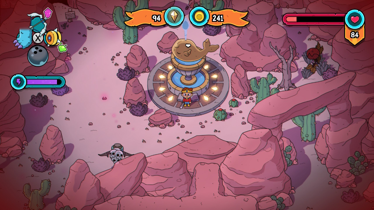 Comme précisé ci-dessus, le Roguelike occupera une place prépondérante dans la gestion de votre aventure. Lorsque vous mourrez, vous recommencerez le jeu au début, seul le niveau de votre épée sera conservé, il sera également possible de conserver certains de vos objets en échange d’une somme d’argent accumulée durant vos runs. Vous aurez donc tout intérêt à récolter un maximum de petits rubis afin d’être certain de pouvoir exporter un maximum de vos objets au cours de vos parties. Le monde sera également différent, et même si les décors et village seront les mêmes, ils ne seront pas disposés au même endroit sur la carte du jeu (qui est d’ailleurs accessible très simplement grâce au bouton « moins » de la console). Ainsi il vous faudra clairement explorer l’ensemble de la carte pour y dénicher tous ses secrets. Pour compenser cette difficulté, il vous sera possible de prier auprès d’une fontaine, qui en échange de quelques rubis (encore !), vous accordera une vie supplémentaire, sauf si vous chutez contre le boss final.