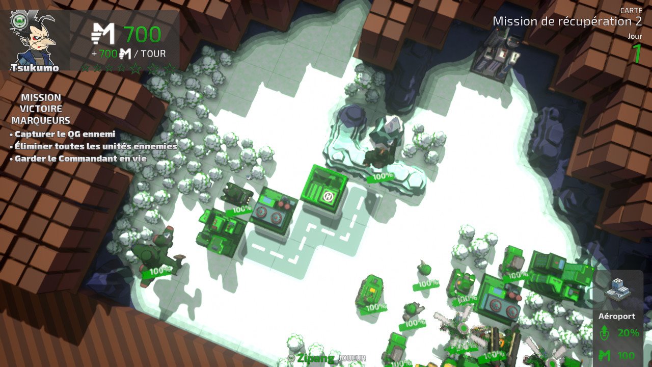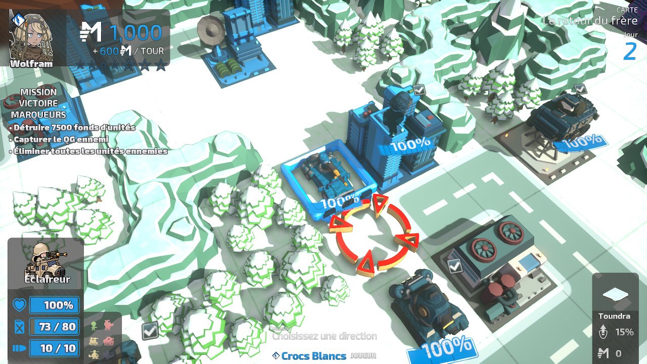 Mais malgré ça, les premières minutes, voire les premières heures, manette en main se révèlent plutôt enthousiasmantes, impression renforcée par le design des unités colorées qui invoque très grandement Advance Wars – et ce malgré cet immonde brouillard de guerre qui gâche complètement l'impression d'un champ de bataille grandiloquent. Comme le jeu de Nintendo, d'ailleurs, Tiny Metal: Full Metal Rumble essaye de toujours introduire de nouvelles unités et éléments de gameplay afin de pallier à la lassitude et de toujours vous faire évoluer et adapter votre stratégie. Et c'est vraiment là que le bât blesse.