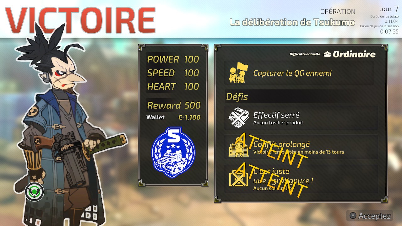 J'ai d'ailleurs fini par lancer tous les combats en « facile », non pas parce qu'ils sont trop durs – ils sont loin d'être simples, mais rien d'insurmontable avec une bonne stratégie, mais tout simplement pour ne pas avoir à supporter cet immonde brouillard de guerre et que ces combats interminables le soient un petit peu moins. Et franchement, même malgré ça, Tiny Metal : Full Metal Rumble m'a semblé absolument sans fin. C'est rare que je rechigne à lancer un jeu, parce que j'aime le jeu vidéo et que je vois le bon dans chaque titre, même le plus mauvais. Mais là, je crois que je n'ai jamais eu autant l'impression d'être dégoûté par un jeu : à partir de la sixième carte, j'ai déjà eu le sentiment d'avoir fait le tour du gameplay – et la campagne en compte trente-neuf. Parfois, je teste des jeux auxquels j'ai envie de retourner, avec un esprit moins critique et plus ludique. Mais là, celui-là, je ne le relancerai plus jamais.