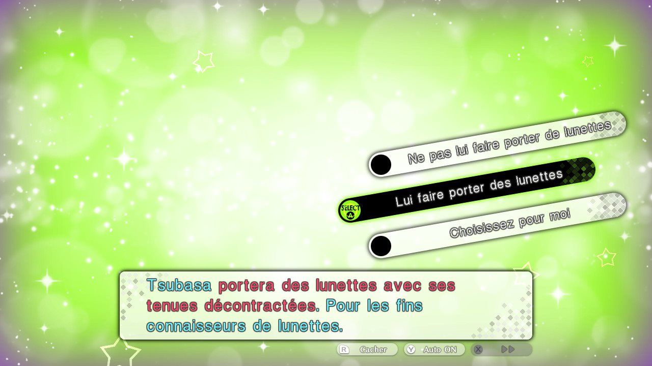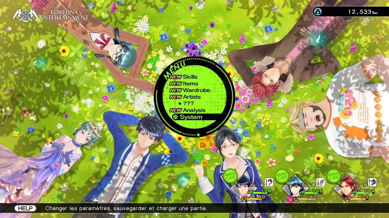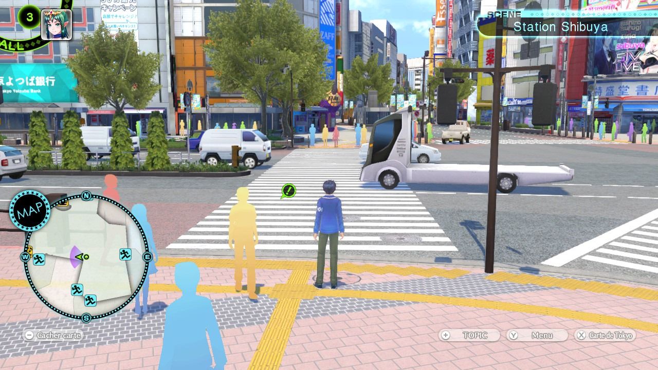 Mais ne vous inquiétez néanmoins pas : si cette histoire est complexe à expliquer à un néophyte, elle se déroule dans la plus grande clarté dans le jeu, grâce à la qualité de sa narration, qui se file entre cinématiques animées de grande qualité et dialogues plus simples – façon visual novel – qui sont, et c'est assez rare pour être souligné, entièrement doublés en japonais par des acteurs fort convaincants, qui ne font qu'augmenter notre affection pour cette bande de personnages bigarrés. La traduction française des textes du titre (sauf, inexplicablement, de ceux des très beaux menus) permettra, qui plus est, à chacun d'entre nous de profiter de cette histoire simple mais passionnante. Un bon point à mettre sur l'édition du jeu par Nintendo car fort est à parier qu'Atlus et ses distributeurs européens auraient été beaucoup plus frileux à l'idée d'offrir des traductions locales aux habitants du Vieux Continent.